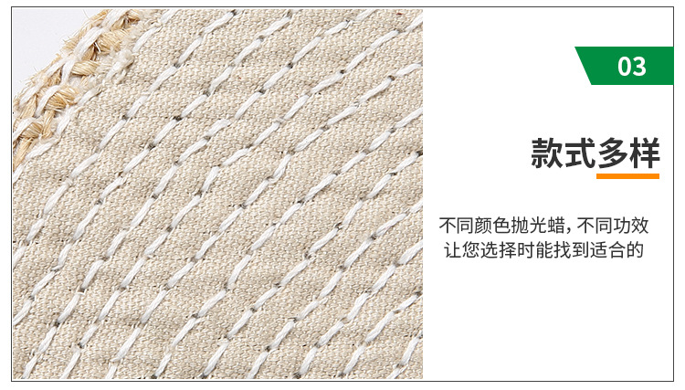 麻轆:可分為油麻轆和布麻轆。麻轆采用優良劍麻為原材料,經再三深加工布成為一種堅硬的拋光材料,油麻轆主要用于不銹鋼制品自動拋光生線,布麻轆通常用于拋金屬制品,種類齊全,規格有直徑50mm——500mm不等